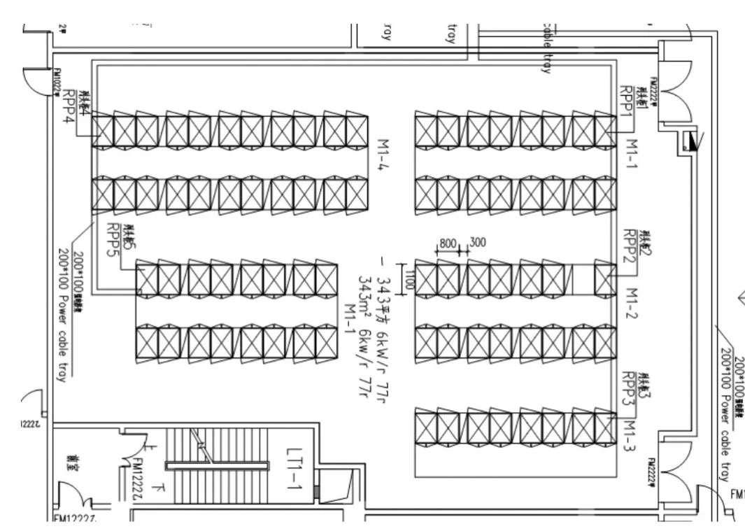 本文以某約300平米的電力機(jī)房為例,進(jìn)行母線槽方案和傳統(tǒng)列頭柜方案設(shè)計(jì)比較。該區(qū)域可布置9列機(jī)柜,每個(gè)列頭柜對(duì)就近兩列機(jī)柜供電,每個(gè)機(jī)柜尺寸為800mm×1100mm。如下圖2所示: