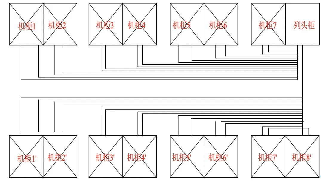 方案2:如果采用傳統(tǒng)的精密列頭柜配電方案,則需為兩列機(jī)柜配置1個(gè)精密列頭柜,并向每面機(jī)柜提供雙電源供電。如圖3所示。