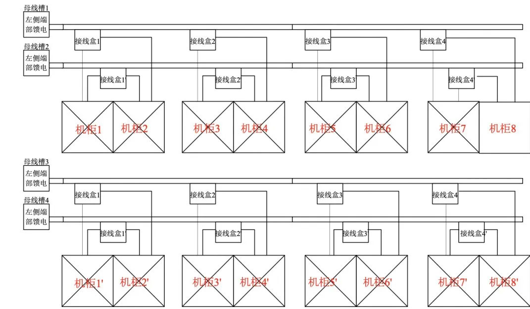 端部饋電模塊由每一列機(jī)柜對(duì)應(yīng)的主備供母線槽各配置1個(gè)接入配電盒,與主干母線槽的插接箱間采用電纜連接。