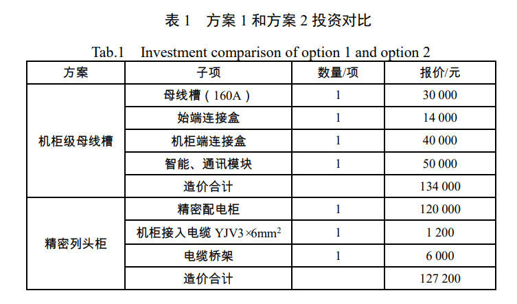 針對(duì)方案1和方案2不同機(jī)柜末端配電方案,兩者的投資造價(jià)對(duì)比如下,如附表1所示。