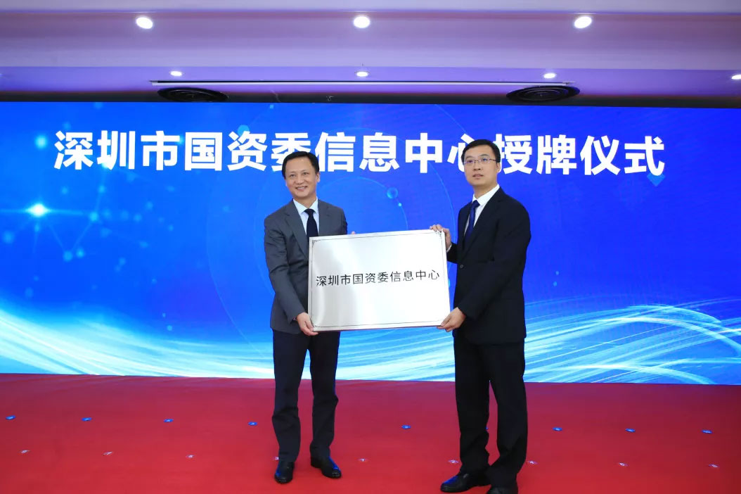 余鋼主任代表市國資委向智慧城市集團(tuán)授予“深圳市國資委信息中心”牌匾,授權(quán)智慧城市集團(tuán)代表市國資委對智慧城市智慧產(chǎn)業(yè)布局開展頂層設(shè)計(jì)、宏觀指導(dǎo)以及對智慧國資智慧國企的統(tǒng)籌推動管理。智慧城市集團(tuán)董事長余錫權(quán)上臺接受牌匾。