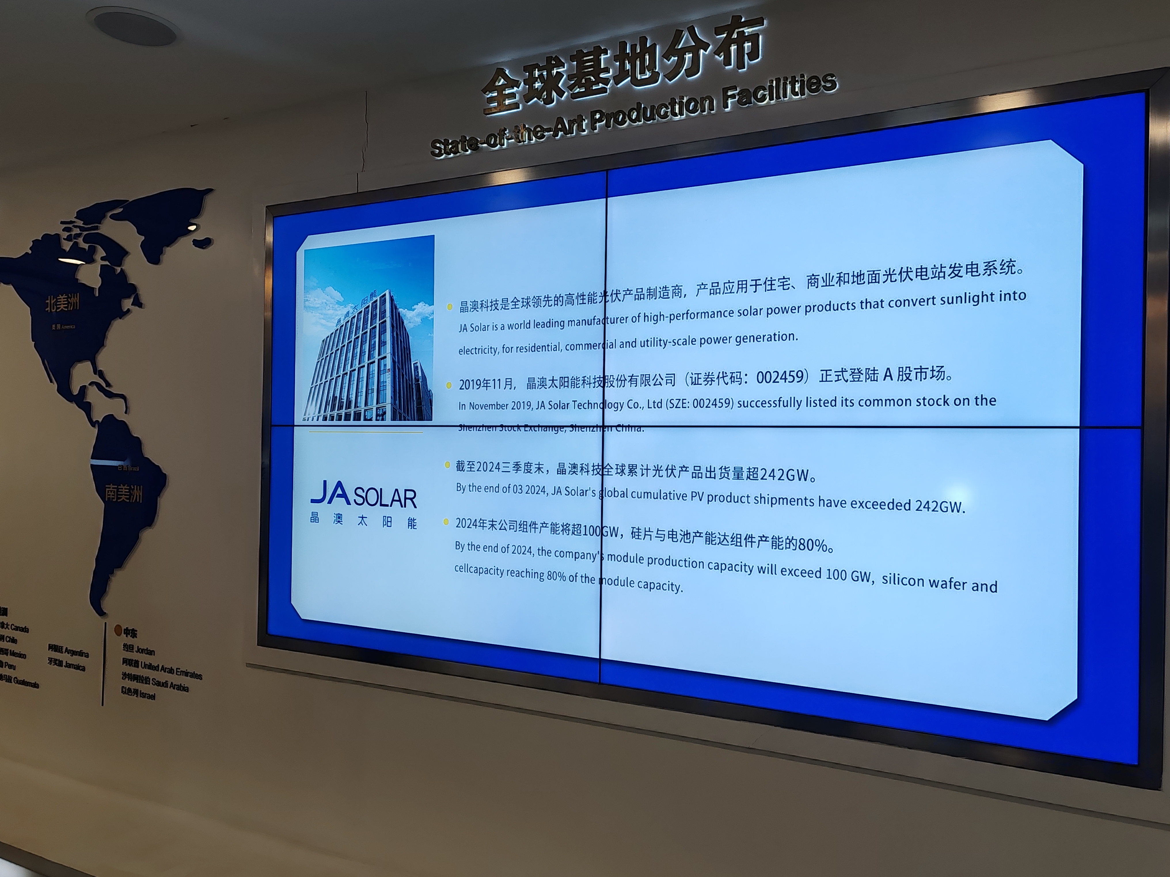 晶澳科技是全球領(lǐng)先的高性能光伏產(chǎn)品制造商,產(chǎn)品應(yīng)用于住宅、商業(yè)和地面光伏電站發(fā)電系統(tǒng),2019年11月,晶澳太陽(yáng)能科技股份有限公司(證券代碼:002459)正式登陸A股市場(chǎng),年?duì)I收約1000億元。全球共19個(gè)生產(chǎn)基地,客戶遍布世界各地。